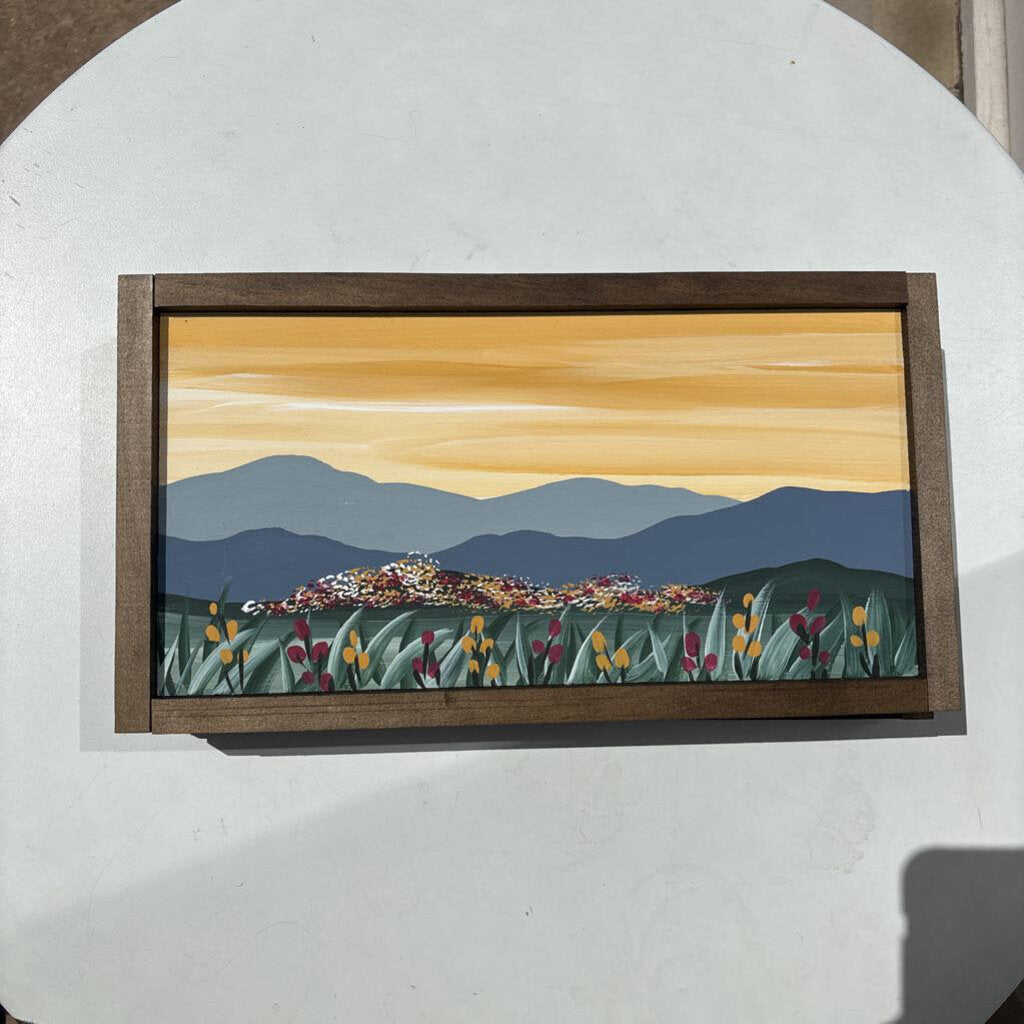 Due to the size of her larger mountain paintings, they are available for purchase in store only. But we carry several styles and a range of size dimensions. Stop in and check them out, or text us to inquire.