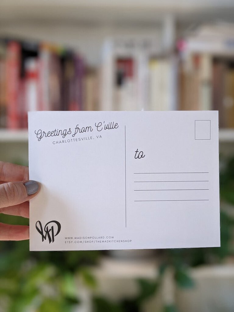 This 5"x7" vertical postcard is essentially a mini print and a sweet, illustrated reminder of Charlottesville, VA.