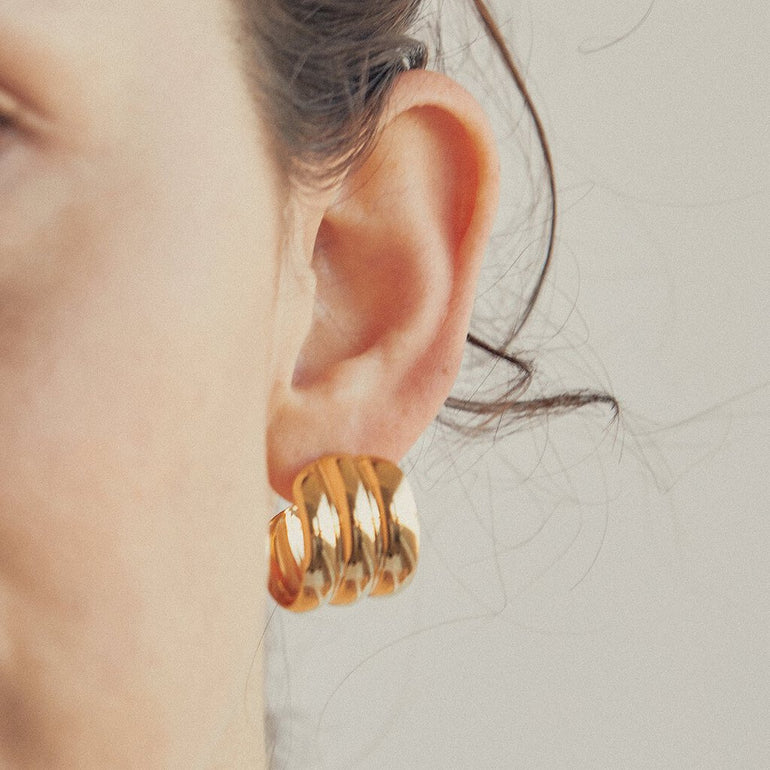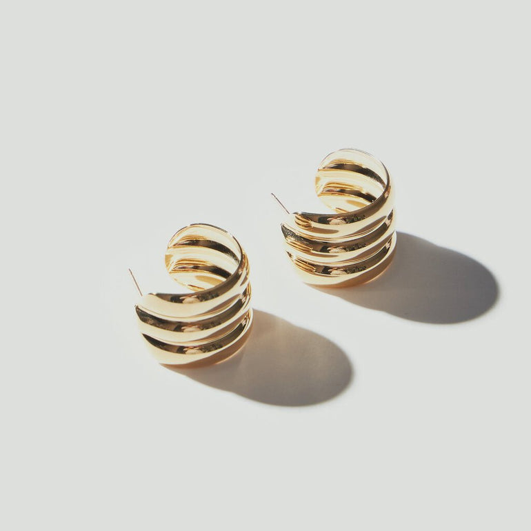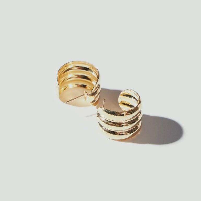A lightweight statement earring with a triple ridged design. Also available in silver.