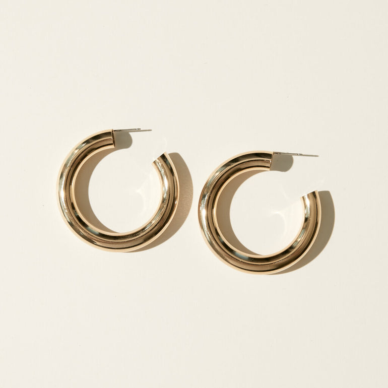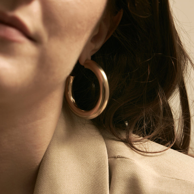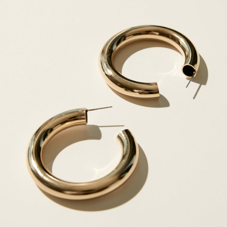 Simple and minimal in design, these hollow, lightweight hoops make a statement. Also available in a smaller size.