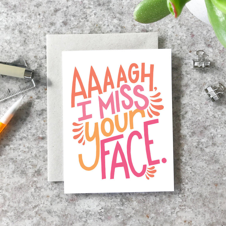 "Aaaagh, I miss your face" // This greeting card is 4.25" x 5.5", blank inside, and professionally printed on a smooth heavy card stock. Cards are paired with a light brown envelope and packages inside a clear plastic card sleeve.