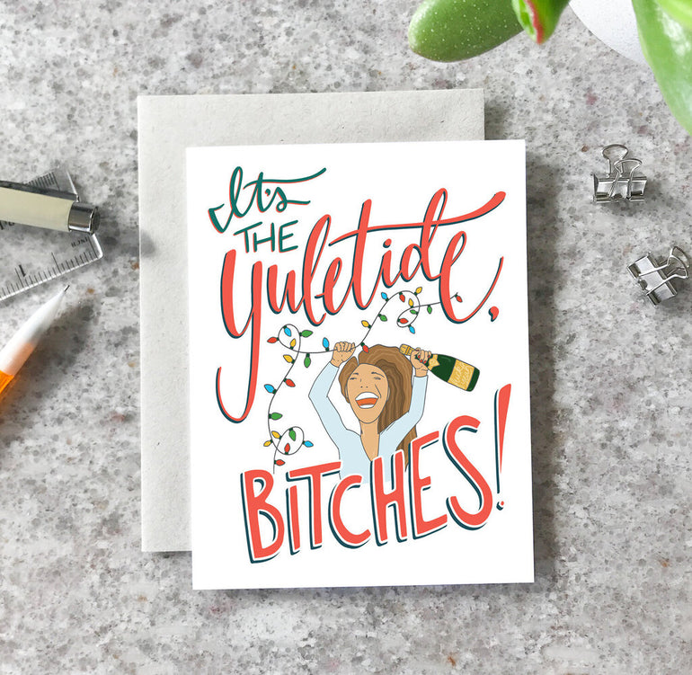 "It's the yuletide, bitches!" // This greeting card is 4.25" x 5.5", blank inside, and professionally printed on a smooth heavy card stock. Cards are paired with a light brown envelope and packages inside a clear plastic card sleeve.