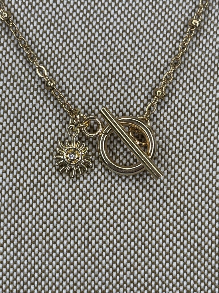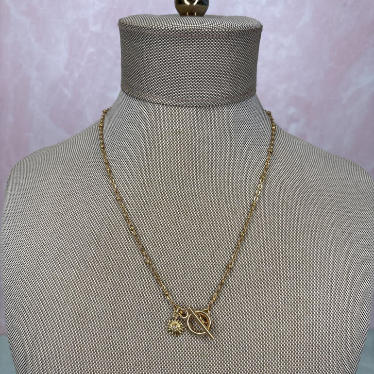 18k gold plated 304 stainless steel charm with 304 stainless steel cable chain. Measures 17.5".