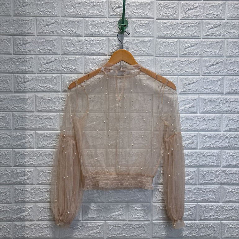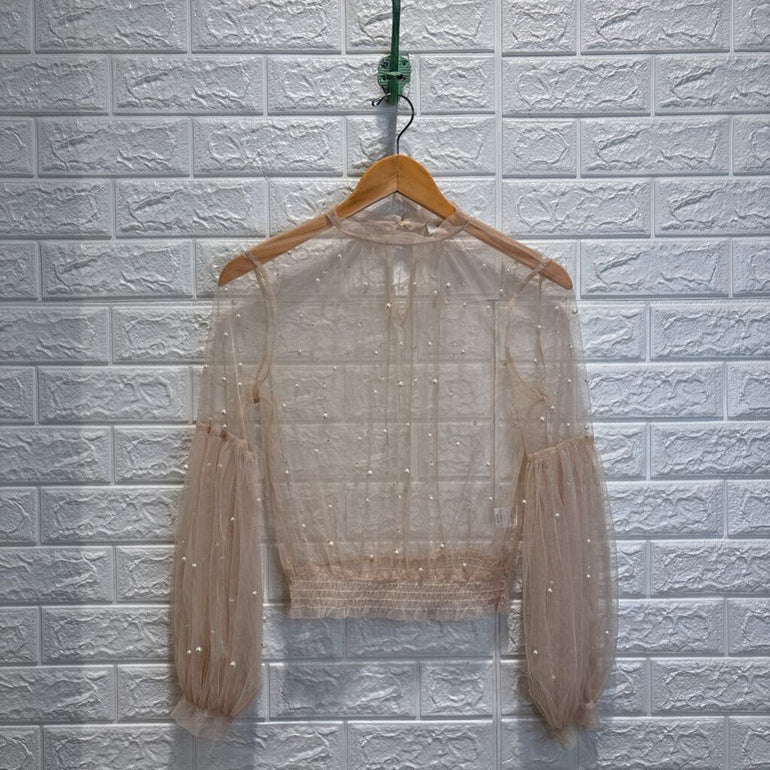 Faux Pearl Beaded Mesh Top