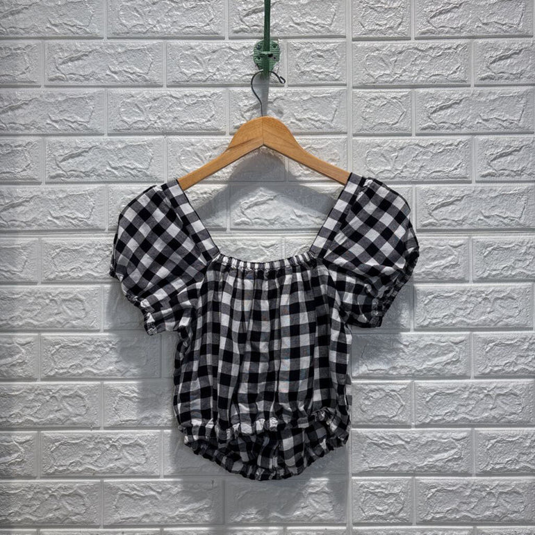 Gingham Linen Blend Puff Sleeve Button Front Crop Top