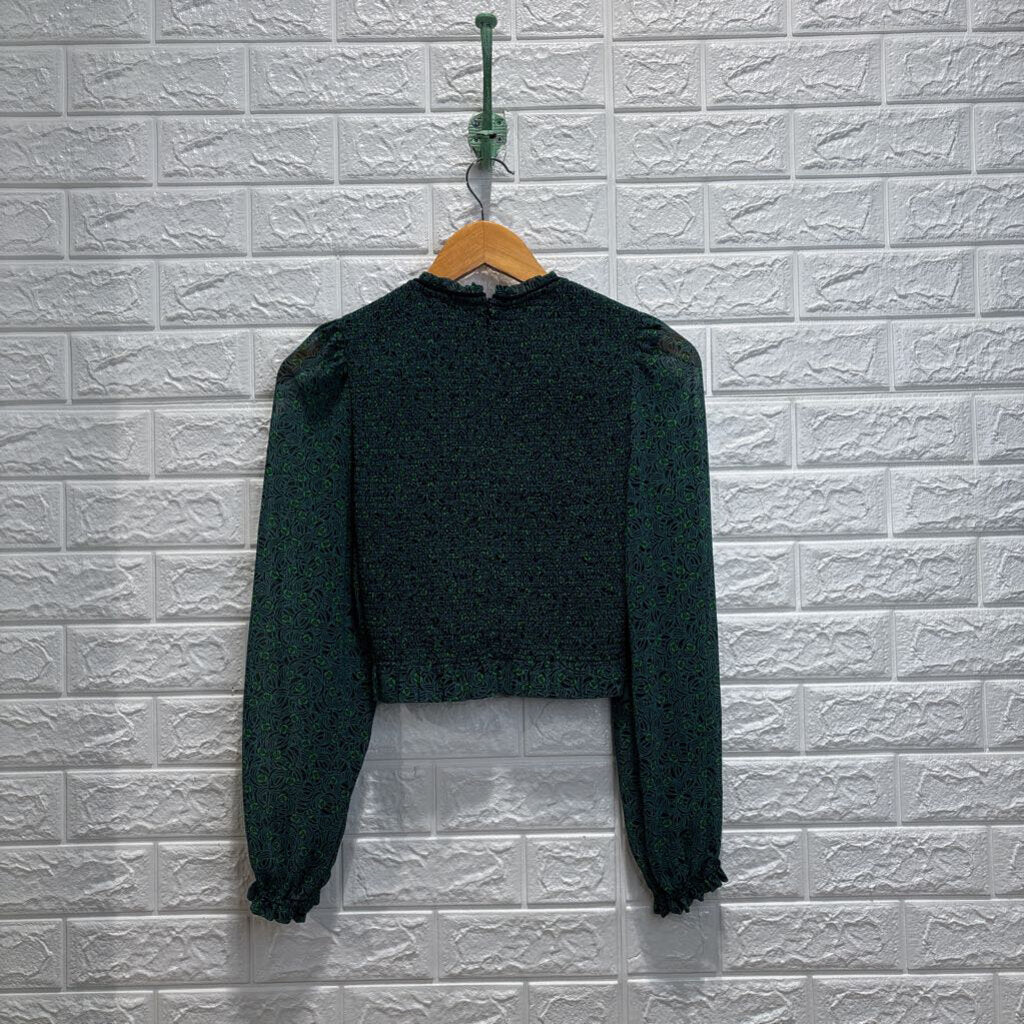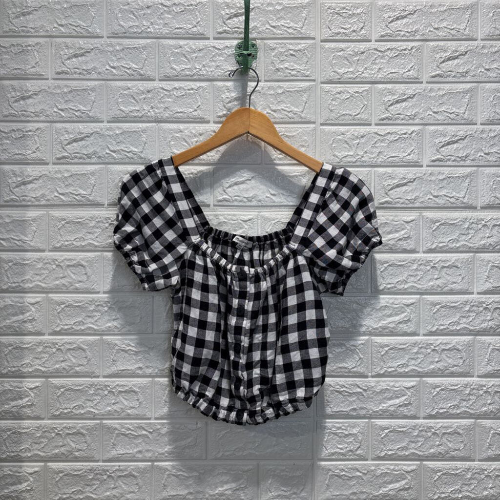 Gingham Linen Blend Puff Sleeve Button Front Crop Top