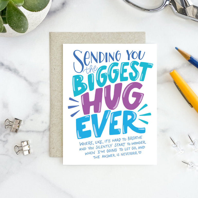 "Sending you the biggest hug ever. Where, like, it's hard to breathe and you silently start to wonder when I'm going to let go, and the answer is neverrrrr." // This greeting card is size A2 (4.25” x 5.5”), blank inside, and professionally printed on a smooth heavy card stock. Cards are paired with a light brown kraft envelope and packaged inside a clear plastic card sleeve.