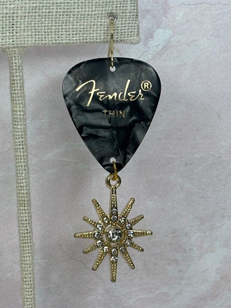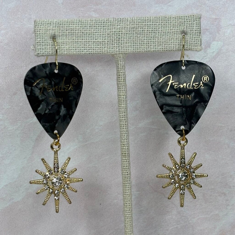 Made with hypoallergenic stainless steel gold plated hooks and guitar picks.