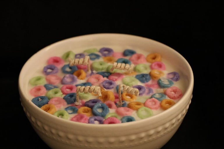 A cereal bowl candle with fruit loops! Measures 6.5" x 3.5" x 3.5".