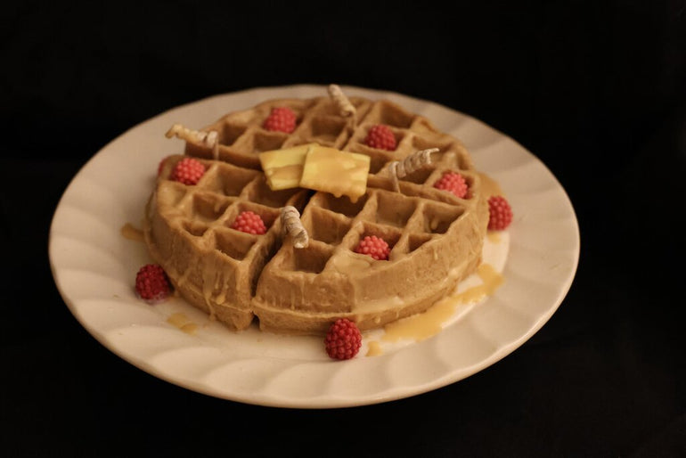 A waffle candle with syrup, butter, and raspberries. Measures 6" x 3" x 3".