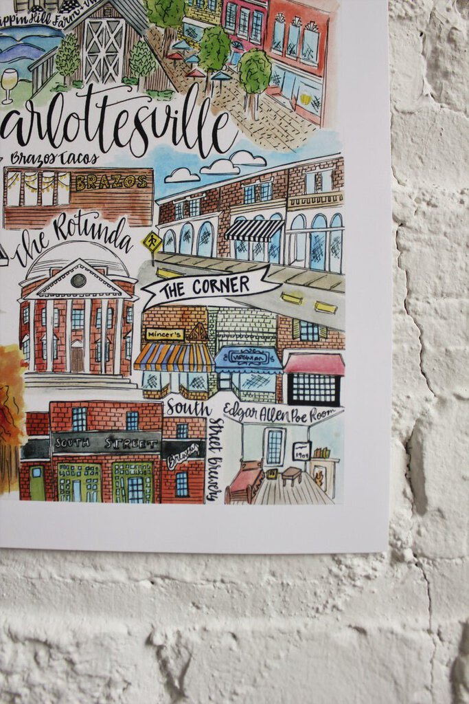 This 11" x 8.5" print of Charlottesville, Virginia's staples was drawn with pencil, painted with watercolor, then drawn again with fountain pen. The print features some of the most distinguishing landmarks, attractions, small businesses and restaurants of Charlottesville and the University of Virginia's campus.