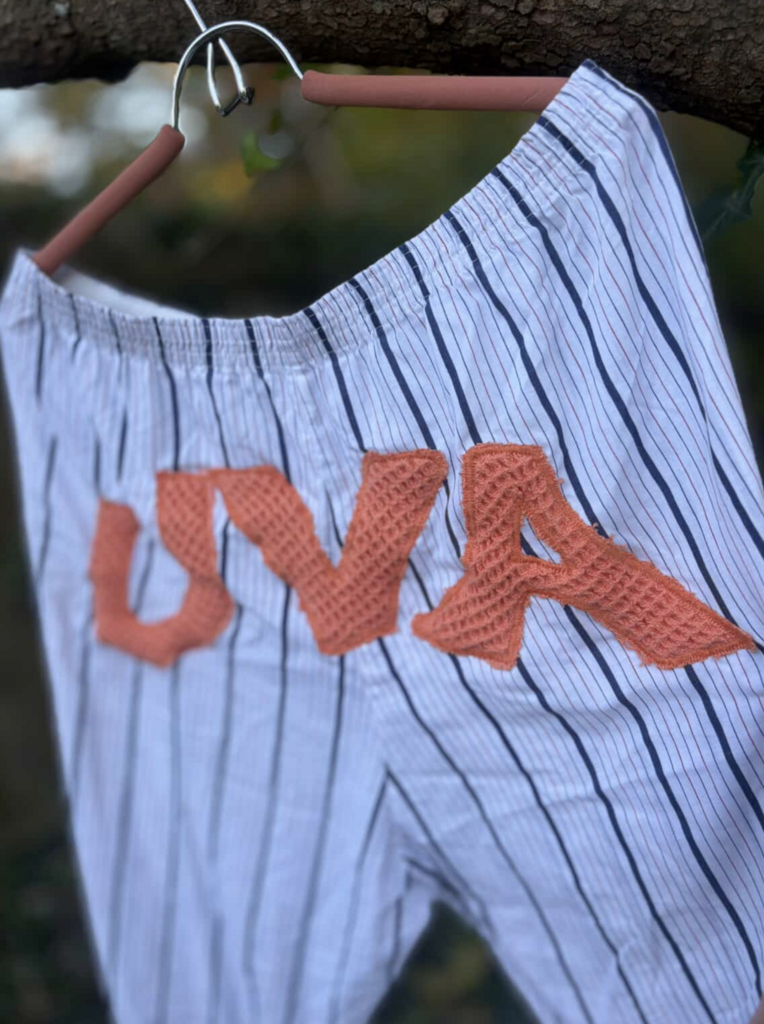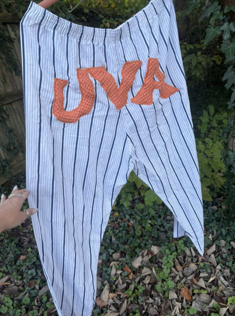 Upcycled pull on pants! One of a kind made from recycled fabrics.