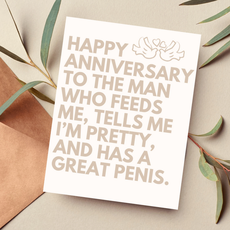 When “Happy Anniversary” doesn’t quite cut it. This card is for the man who feeds you, tells you you’re pretty, and brings ahem certain other qualities to the table. Snarky, romantic, and 100% unforgettable.