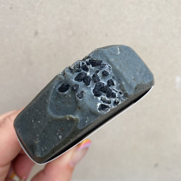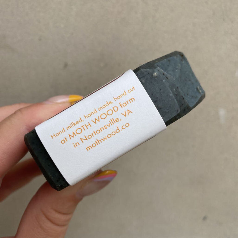 Goat milk soap bar with notes of cedar, orange, & spices, and features activated charcoal and espresso as an exfoliants.