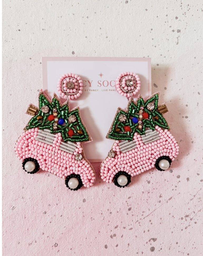 These festive handmade beaded earrings feature detailed pink car designs inspired by our friend the pink figgy. Perfect for the holiday season, these earrings are sure to make any outfit sparkle.