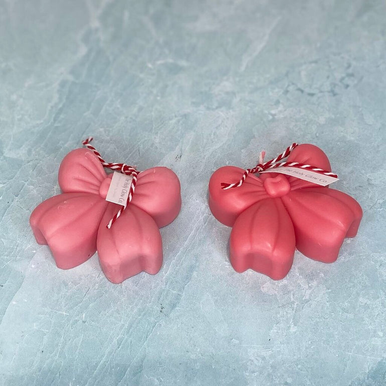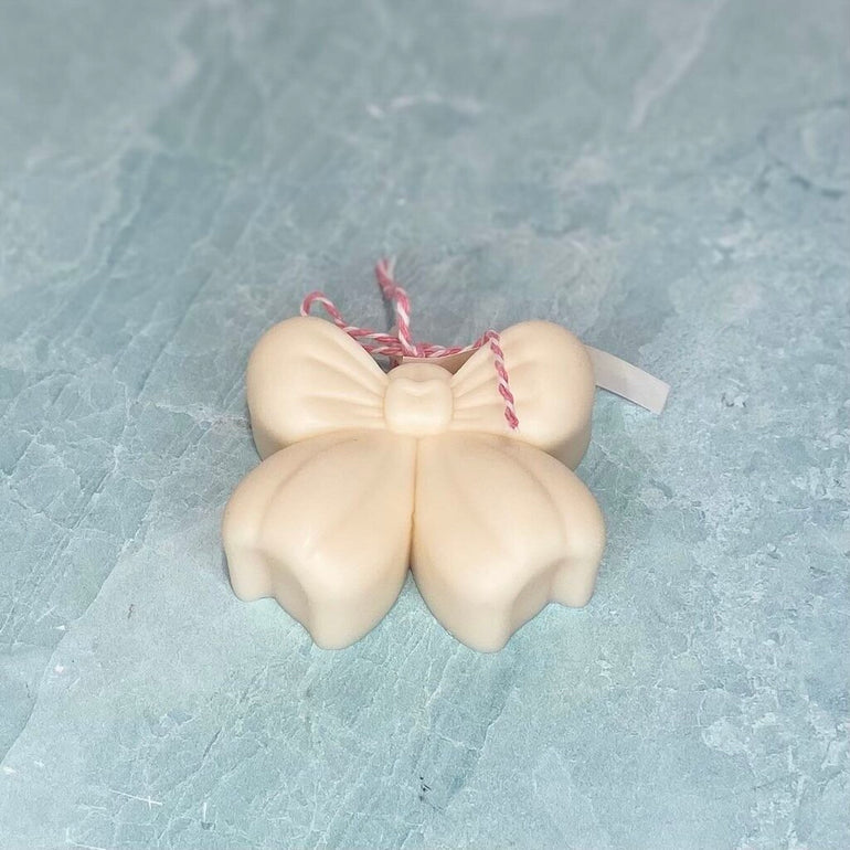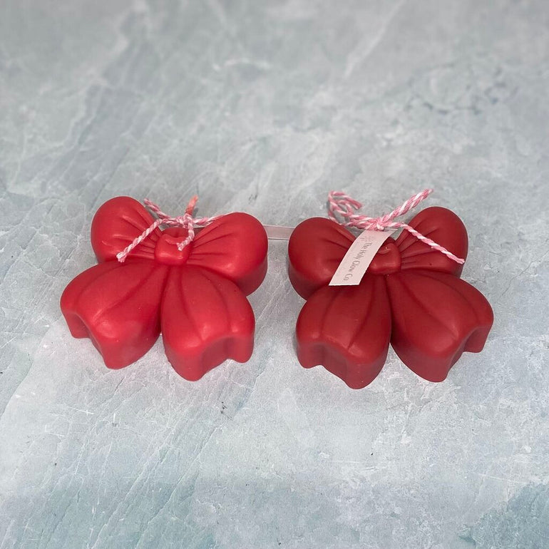 A handmade puffy bow candle with a mild scent! Measures 3" x 3". Since these candles are handmade, each is unique and has some color variation!
