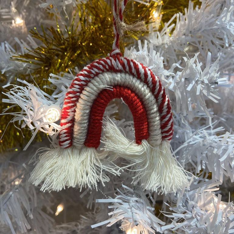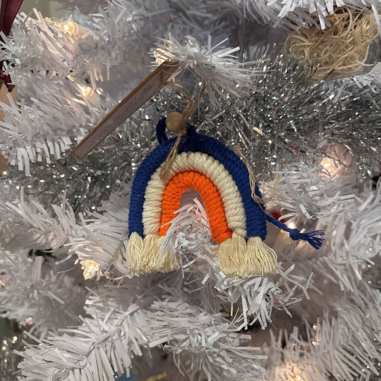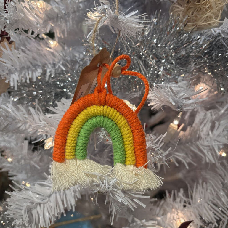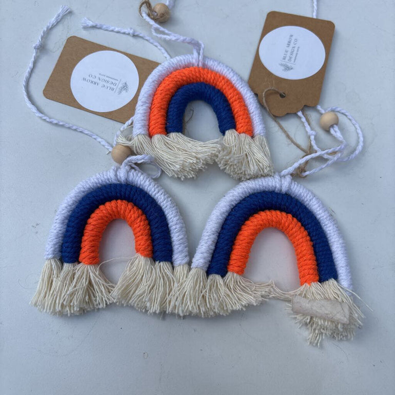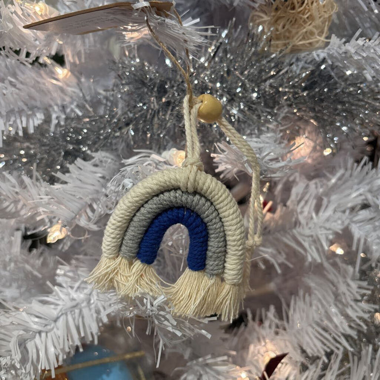 This macrame rainbow car ornament brings a bit of festivity and flair to your drive! Handcrafted with soft, recycled cotton cords, each layer of the rainbow is carefully knotted in soothing pastel or vibrant colors, creating eye-catching decor. The rainbow is finished with delicate tassel ends, adding to its cozy, handcrafted feel. Hanging from two separate cords, it’s easy to tie to your rearview mirror, where it sways gently as you drive, bringing good vibes on every journey.