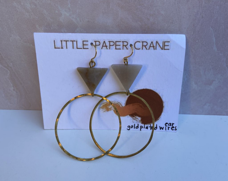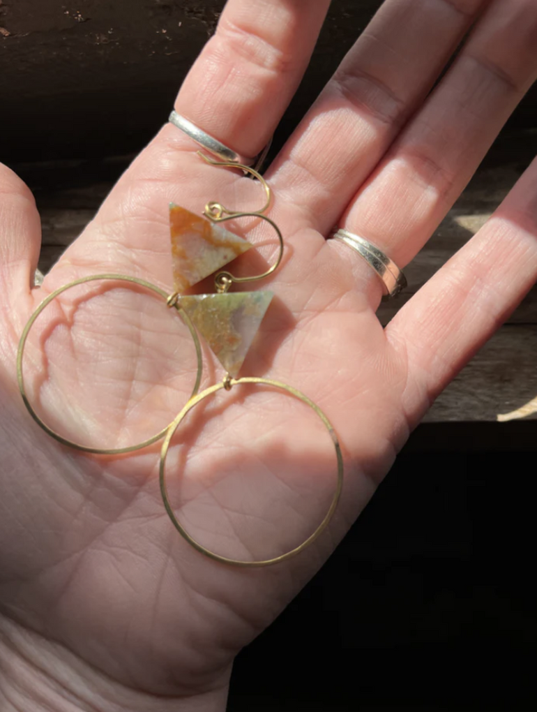 Lightweight hammered brass earrings featuring gorgeous triangle gemstones. Measuring just over 2.5” long on brass ear wires.