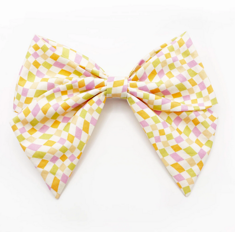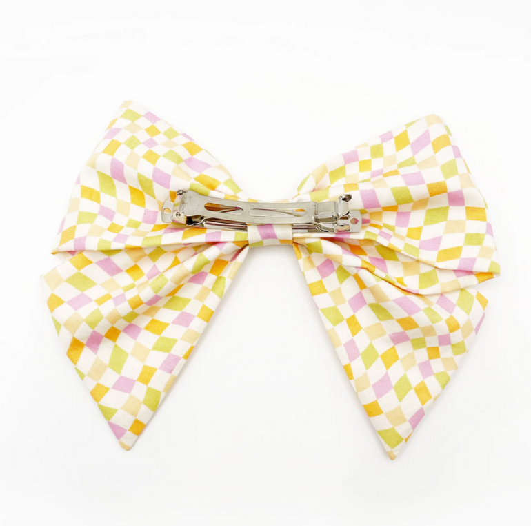 A large handmade hair bow with a pastel checkered print. The cotton fabric is attached to a sturdy barrette clip.