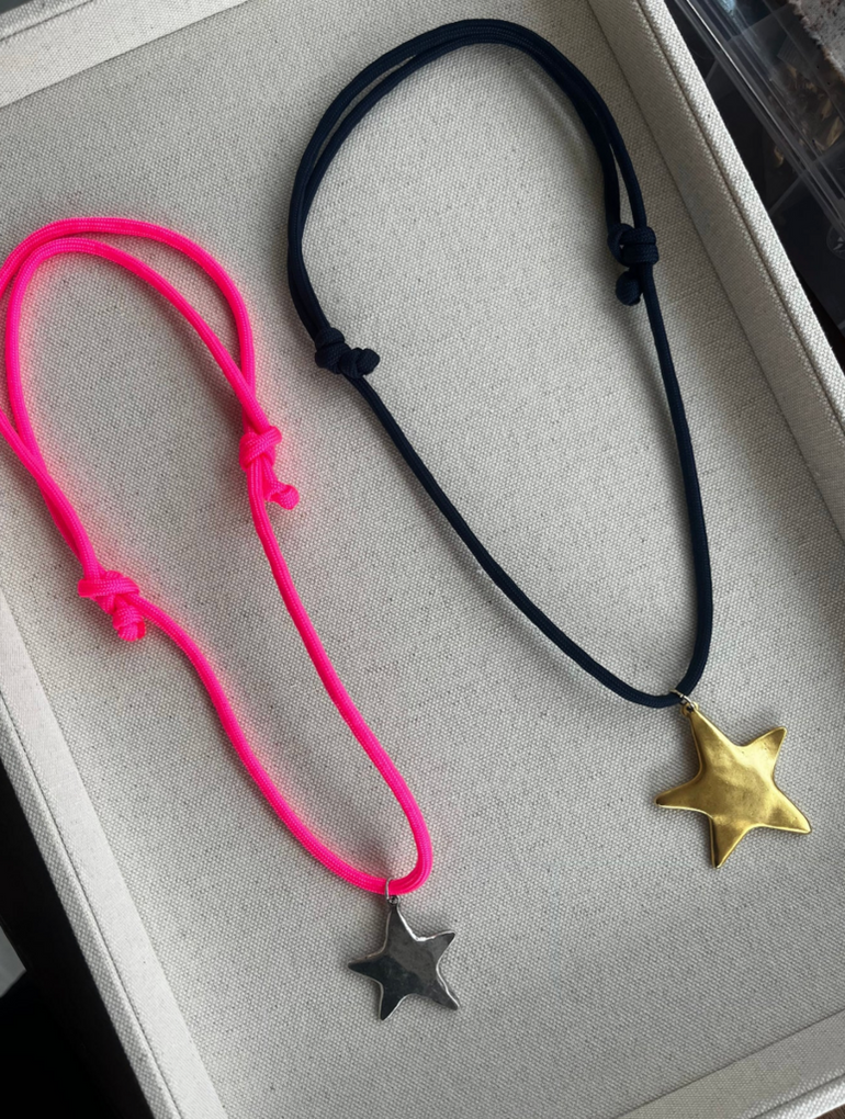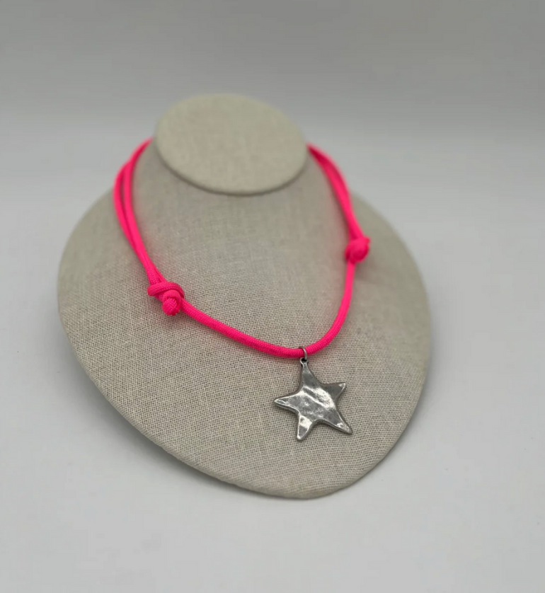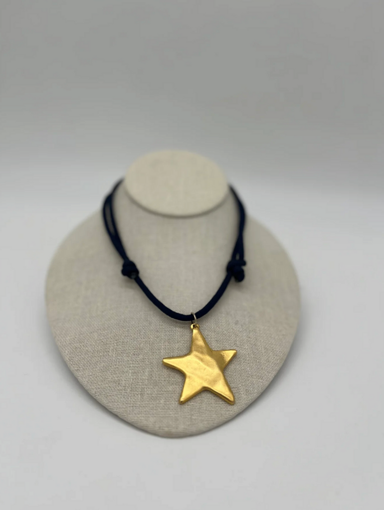 Shine bright with The Hammered Star Necklace, a simple yet stylish piece that adds a cool touch to any outfit. The star pendant has a hammered texture and comes in two finishes—antiqued pewter for a classic silver look and 12k antiqued gold for a warm glow. It hangs on an 18-inch paracord with an adjustable slip knot, making it easy to wear and layer. Perfect for everyday style or a special touch!