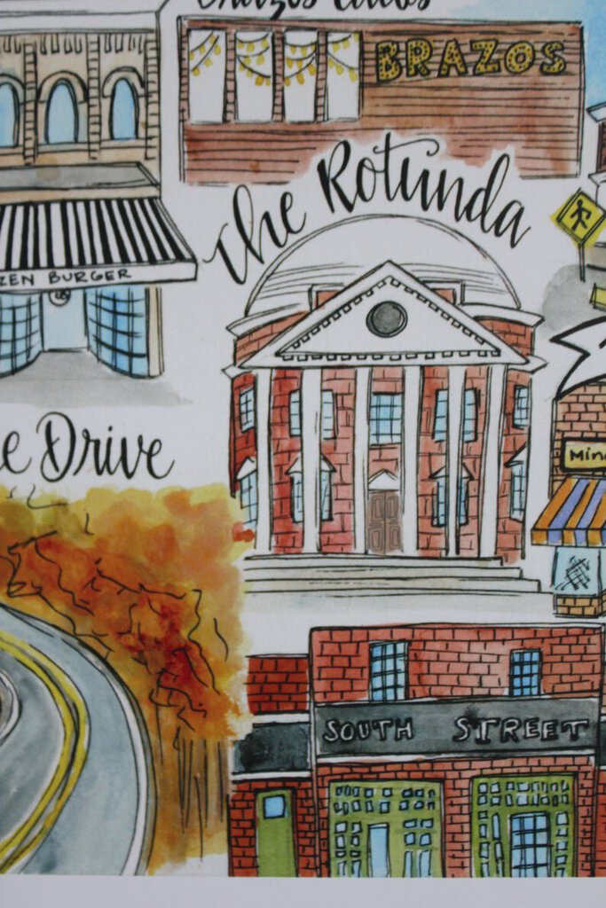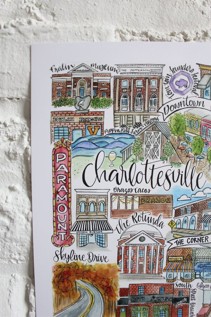 This print includes The Jefferson Theater, Skyline Drive, The Fralin Museum, The Whiskey Jar, Boylan Heights, Pippin Hill Farm & Vineyard, The Downtown Mall, the recognizable Paramount sign, Citizen Burger, Brazos Tacos, The Corner, The Rotunda, South Street Brewery and the Edgar Allen Poe room of UVA.