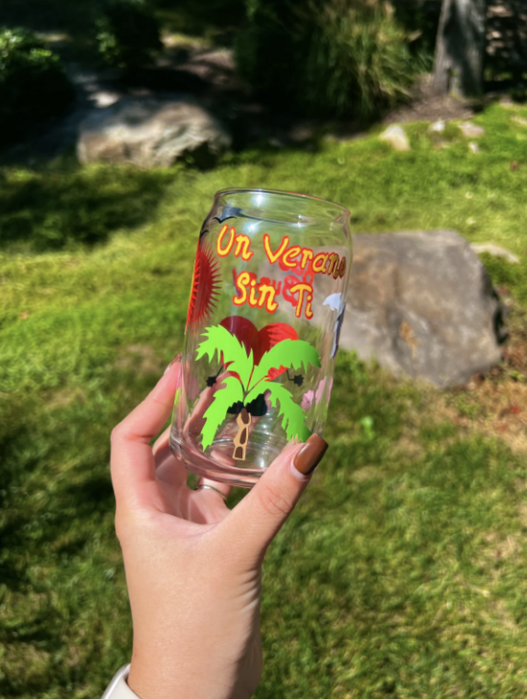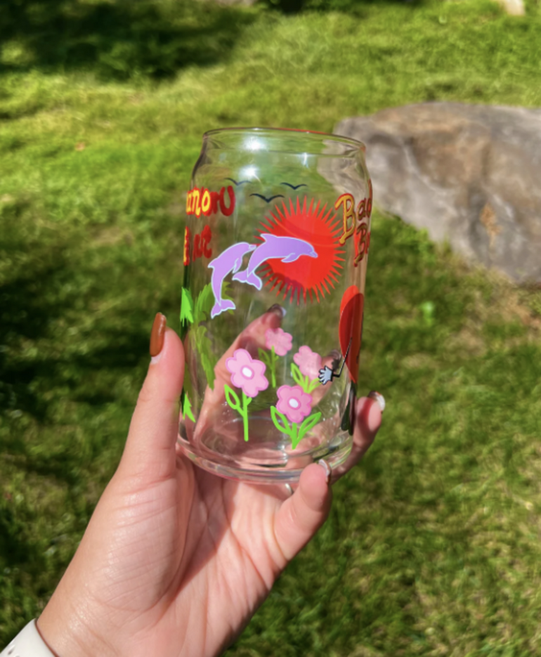 This 16oz glass cup is perfect to enjoy your favorite drinks and make the perfect gifts suitable for hot and cold drinks. The design is made out of durable permanent vinyl.