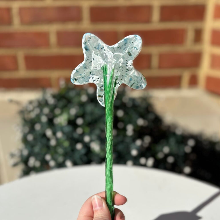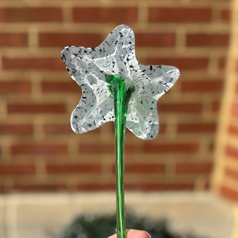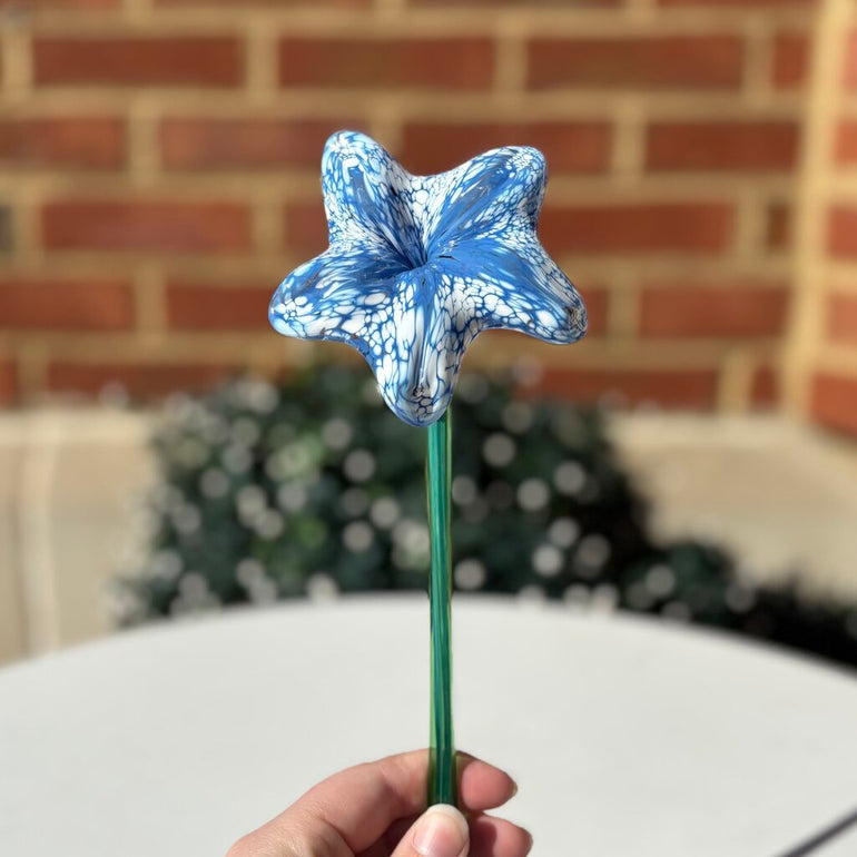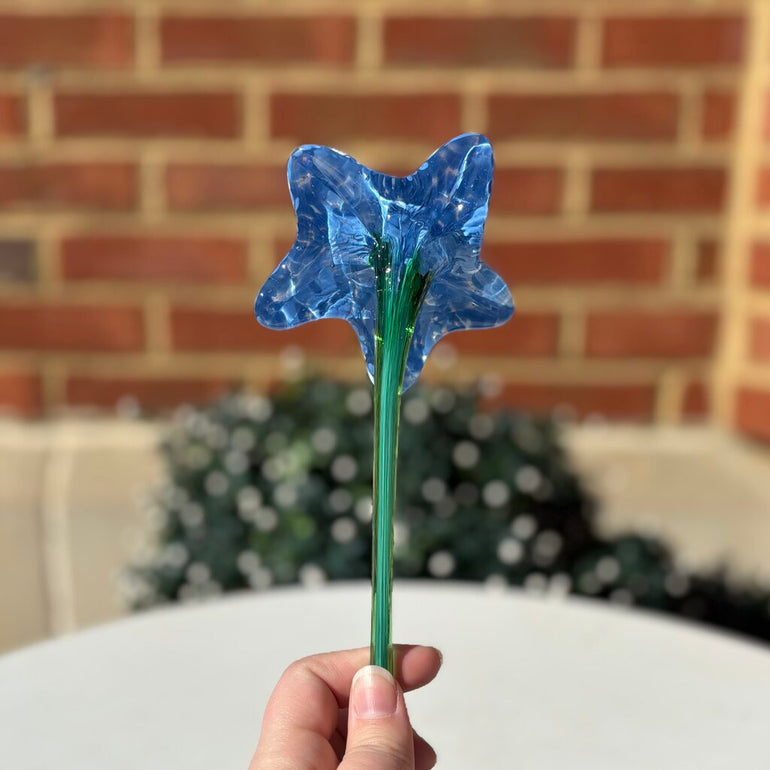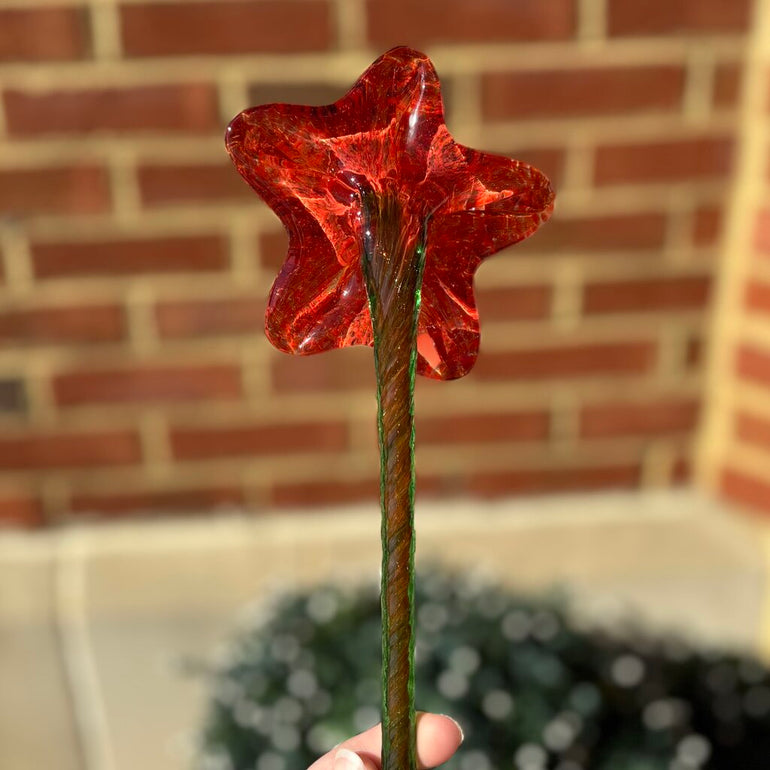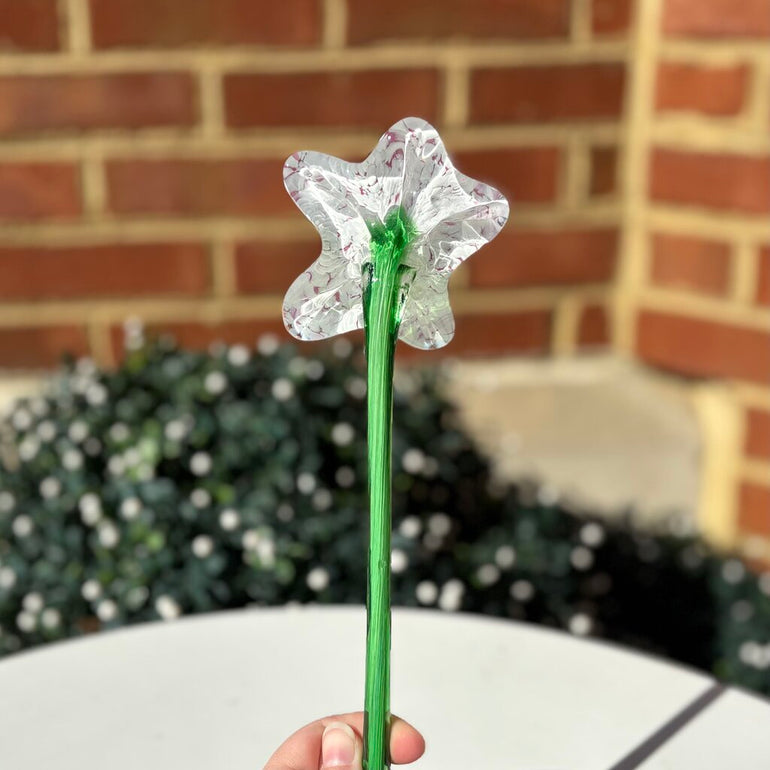 Hand blown glass flowers with long stems. Each is a unique piece of art! Measures approximately 11" long.