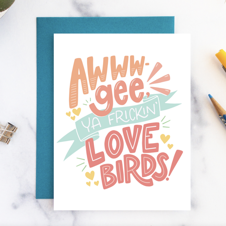 "Awww gee, ya frickin' lovebirds!" // This greeting card is 4.25" x 5.5", blank inside, and professionally printed on a smooth heavy card stock. Cards are paired with a dark blue envelope and packages inside a clear plastic card sleeve.