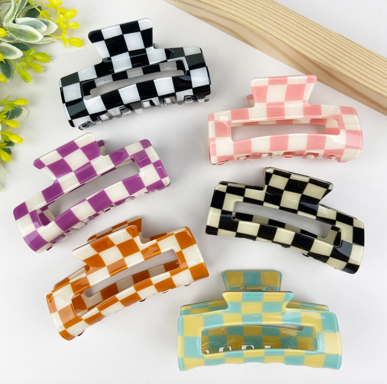 Material - PVC Handling Process - Handmade Hairpin Classification-Hair ClipIt The checkerboard pattern, a classic design consisting of alternating squares in two colors, is prominently featured on the surface of the semicircle. The squares may be in contrasting colors like black and white, creating a visually striking and timeless look.