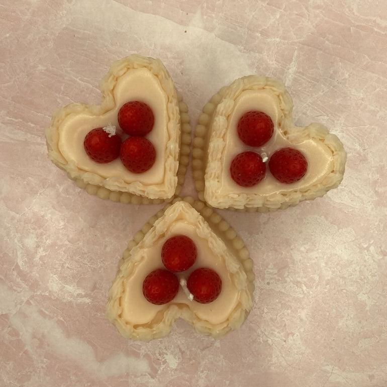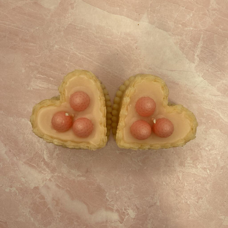 A handmade heart shaped cake candle with a mild fragrance! Measures 3.38" x 1.77" x 3.23". Since these candles are handmade, each is unique and has some color variation!