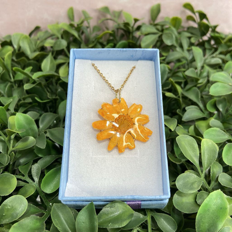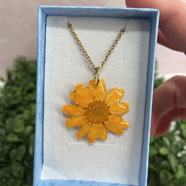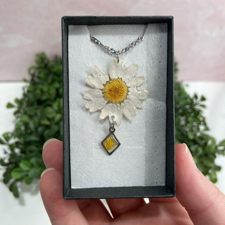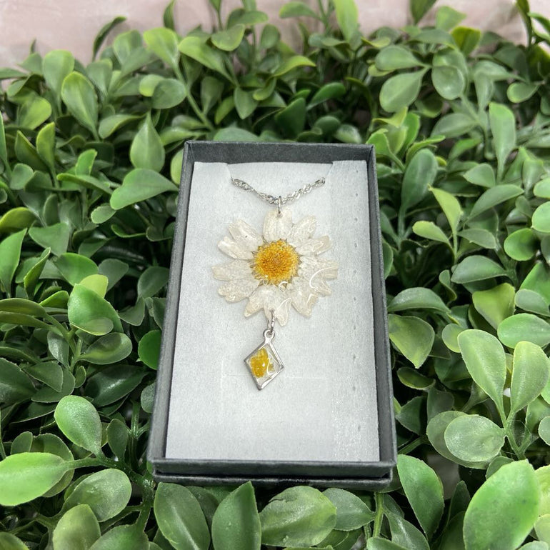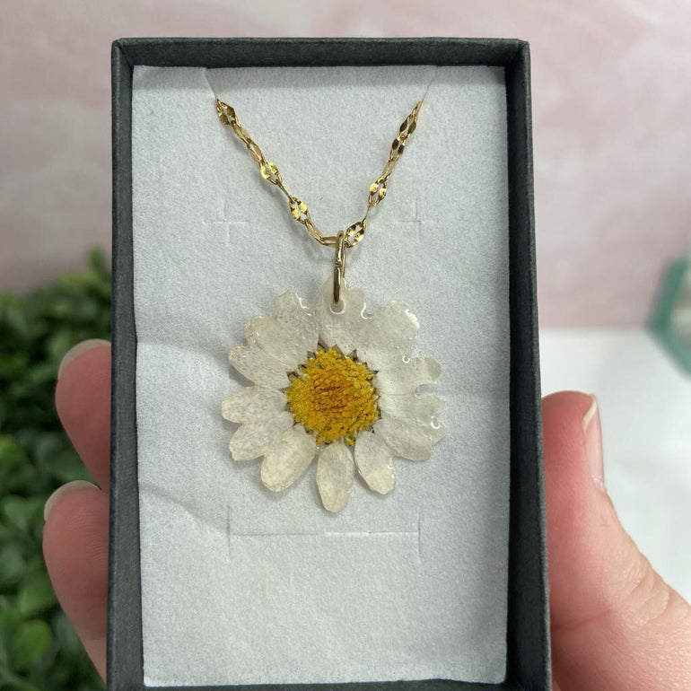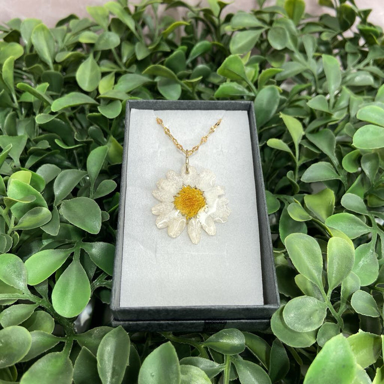 This stunning necklace features a real daisy! This flower is handpicked for its beauty and delicately preserved. No two daisies are the same, making each necklace a unique piece - a true work of nature! Daisies are roughly 1.5 inches in diameter. The brass chain is 18 inches.