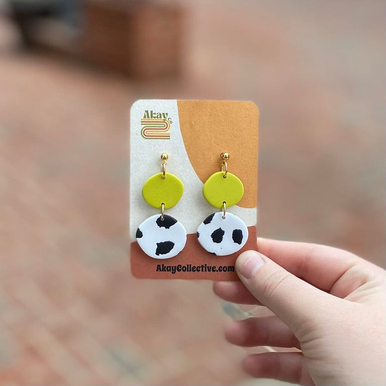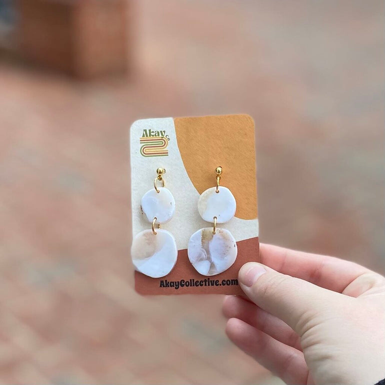 Gold filled posts and jump rings. As each pair is handmade, some variation is to be expected.