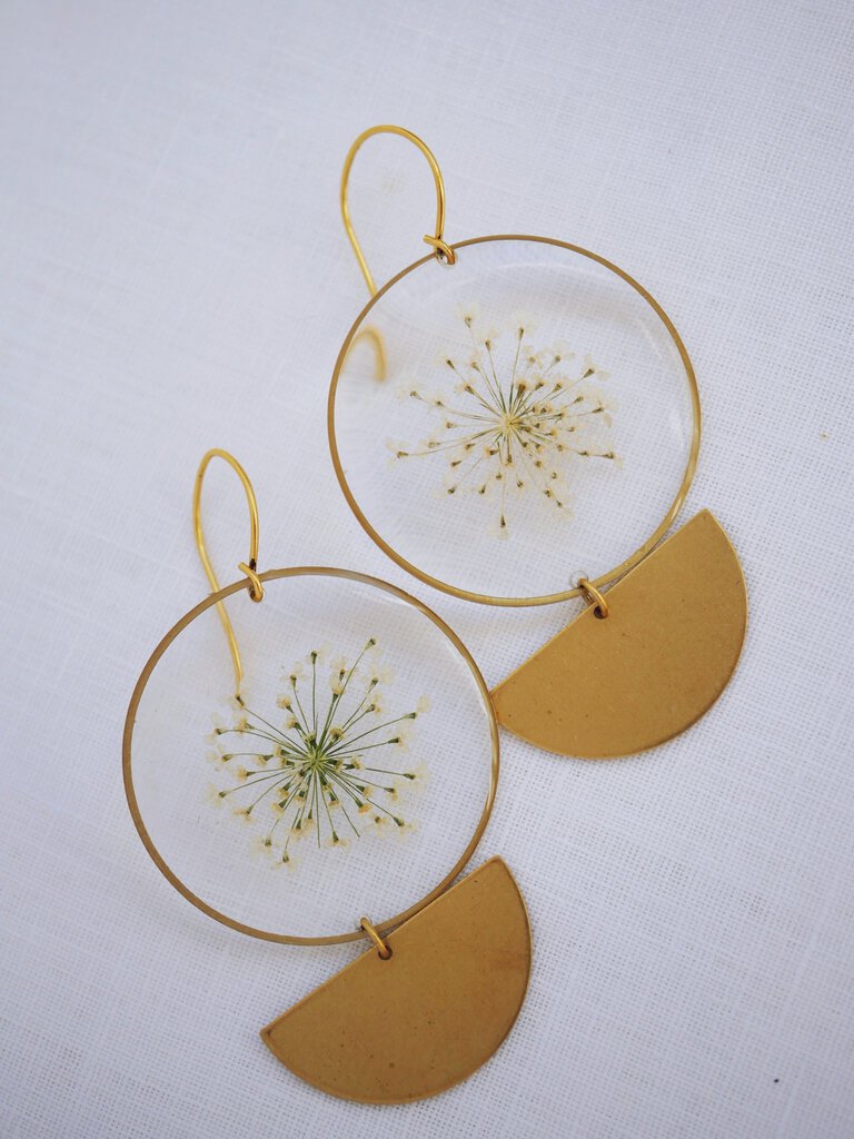The large round brass frames contain a delicate Queen Anne’s Lace flower. A brass half circle dangles beneath for a beautiful modern design. Super lightweight.