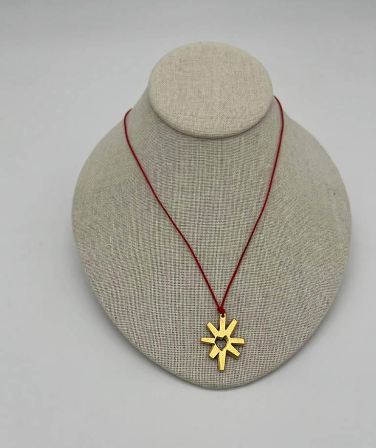 Wear it as a statement necklace or as part of a stack, star burst charm is bound to take your outfit up a notch. Lightweight and easy to wear. 12k Antiqued Gold. 18 inch navy cord, 1 inch charm.