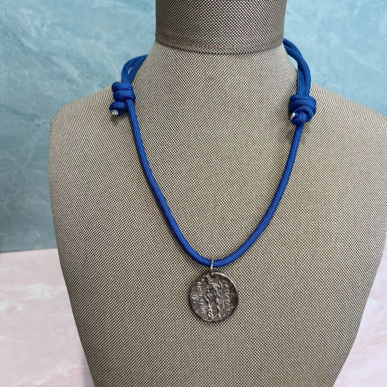 Inspired by ancient coins, these silver tone coin pendants are bold yet minimal. Strung on color pop cords and ready to wear with any outfit.