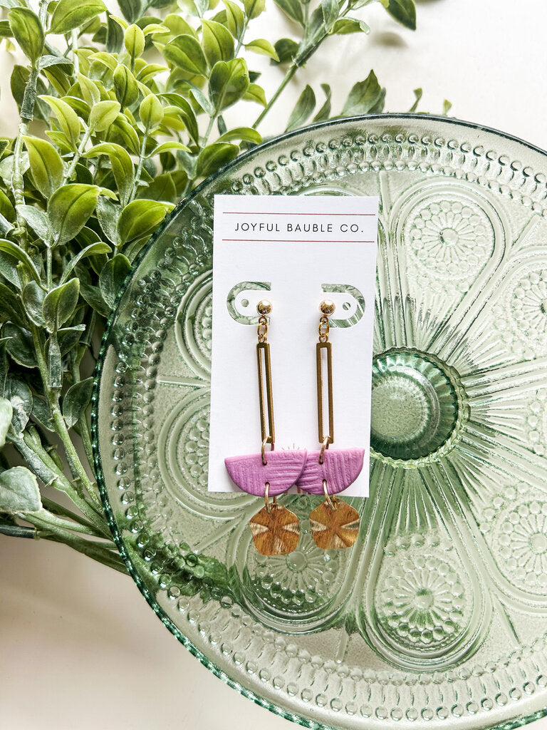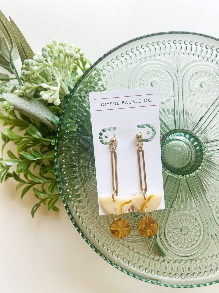 Polymer clay dangle earrings with brass metal accents.