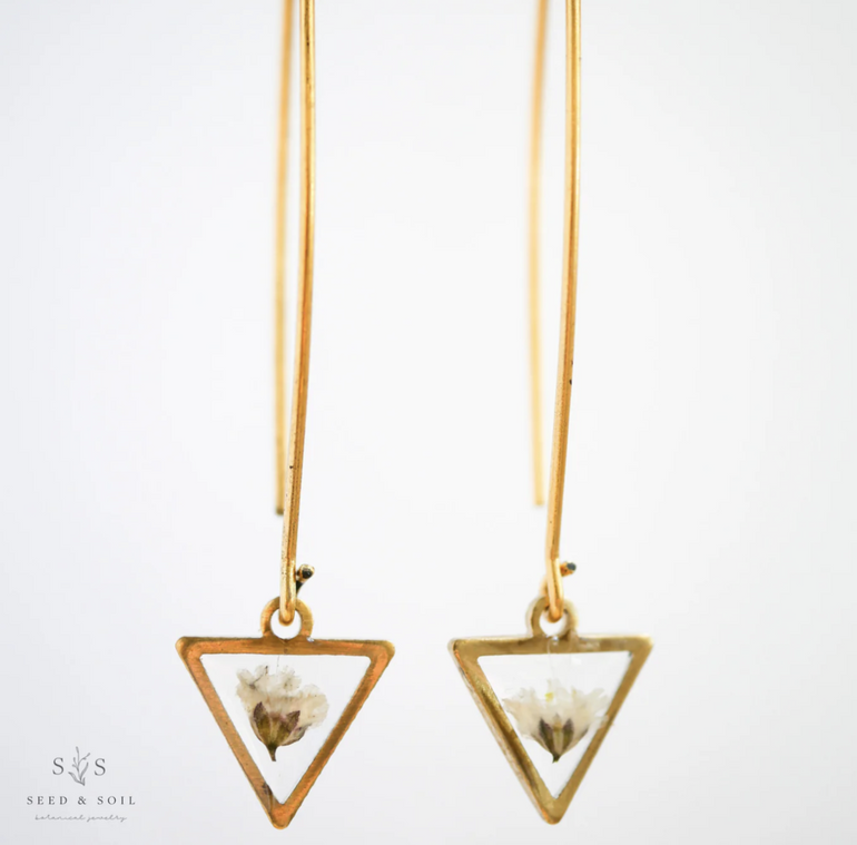 A delicate brass triangle frame dangles from the end of a 24k gold plated threader ear hook. Available in a variety of real preserved botanical.