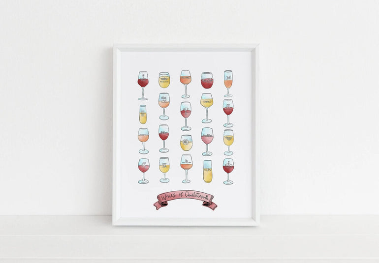 Brightly illustrated print of 20 different wineries in and around Cville, all within an hour of the vibrant city of Charlottesville, Va. Great for any wine lover, Wahoo, or Cville local. Perfect for gifts ranging from a housewarming get-together to a Charlottesville wedding to a going away party to a friend's birthday!
