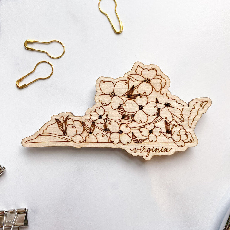 Virginia Dogwoods WOOD MAGNET. // This magnet is laser etched into a smooth birch wood and finished with a super strong magnet on the back. The design features the state of Virginia filled with the state flower - the dogwood.
