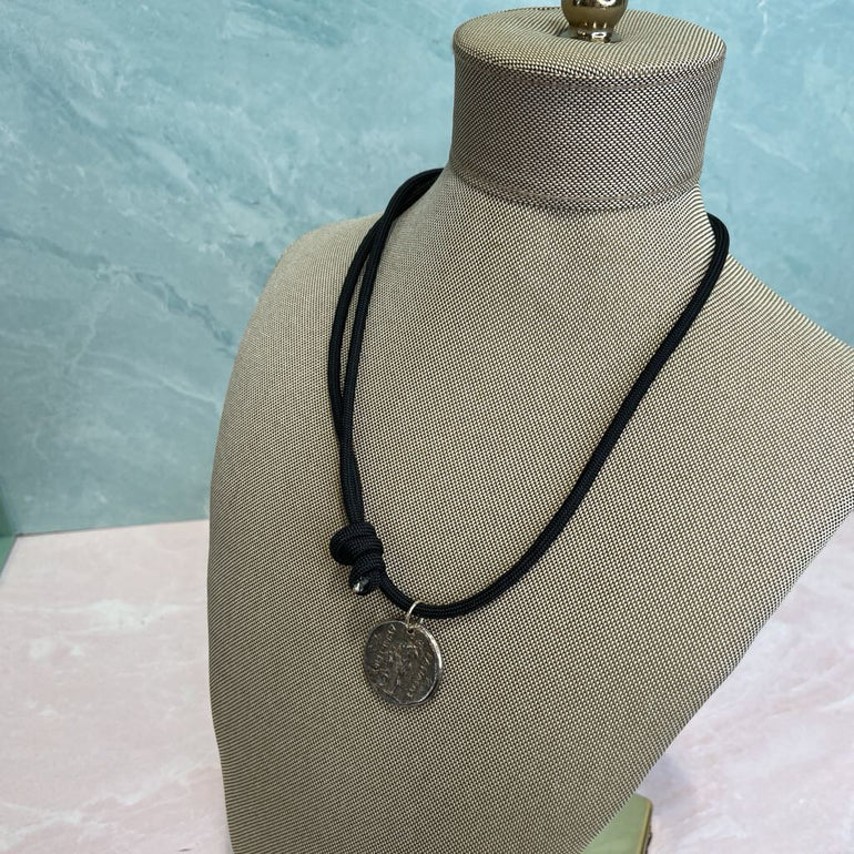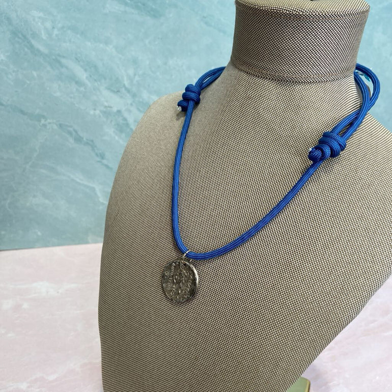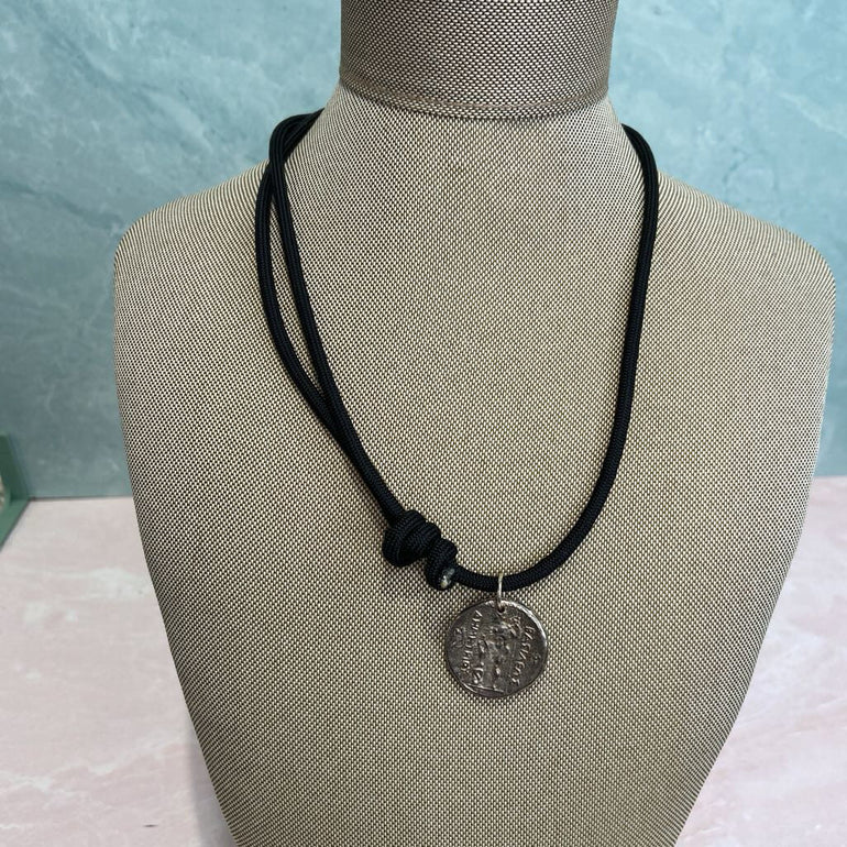 Inspired by ancient coins, these silver tone coin pendants are bold yet minimal. Strung on color pop cords and ready to wear with any outfit.