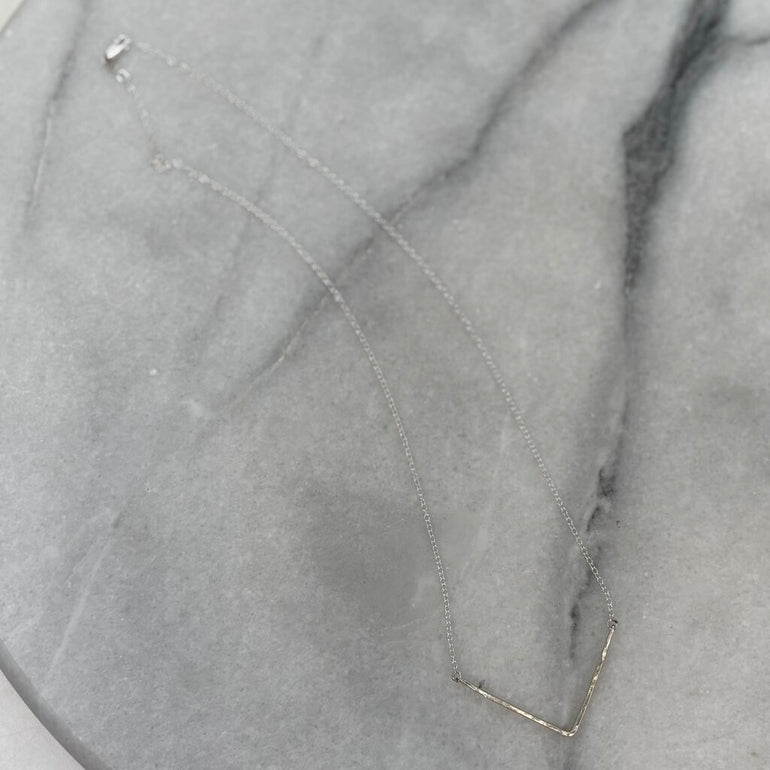 A beautiful silver necklace, featuring a chevron V. It's a lovely dainty piece that goes great with everything!