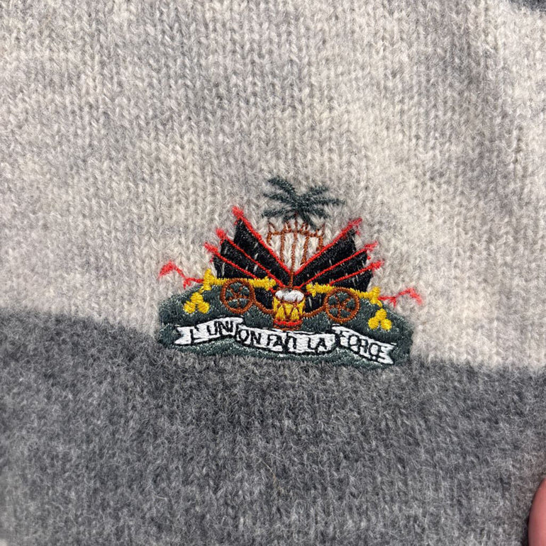 Size estimated, no interior size tag. Features the Haitian coat of arms with the national motto "L'Union Fait La Force" or "Unity Makes Strength." Measurements available upon request!