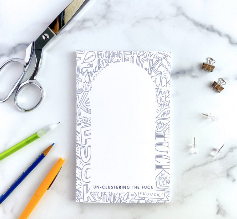 "Unclustering the Fuck" 5X8" notepad w/ 50 pages of 70 lb opaque smooth white paper, glued along the top edge with a 22 pt. kraft chip board backing; packaged in a sealed clear sleeve. Designed in Richmond VA; manufactured in the USA