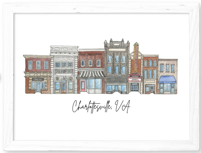 This 8.5" x 11" art print of Charlottesville, Virginia's historic/small business staples was drawn with pencil, painted with watercolor, then drawn again with fountain pen. The print features some of the most distinguishing small businesses and eateries of downtown Charlottesville.