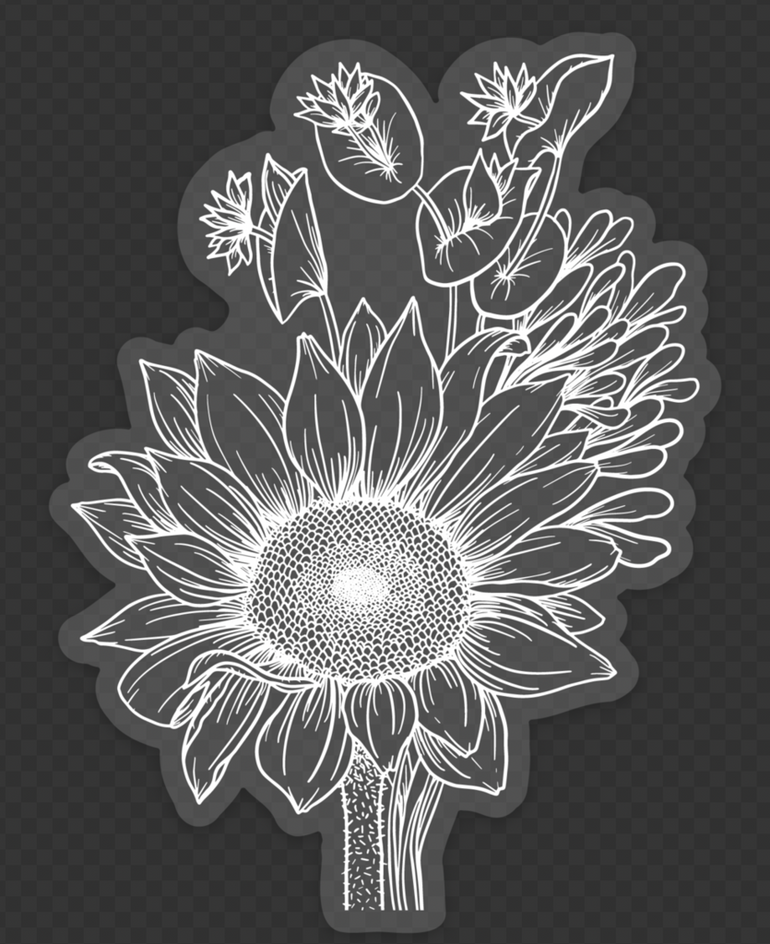 Sunflower WHITE on a CLEAR BACKGROUND // Our scratch resistant vinyl stickers are durable, waterproof, and dishwasher safe. Perfect for your favorite water bottle, laptop, windshield, or tablet case! This original design was hand drawn with pencil and pen, and all Billie Claire products are printed in the US / designed and assembled in Richmond, Virginia.