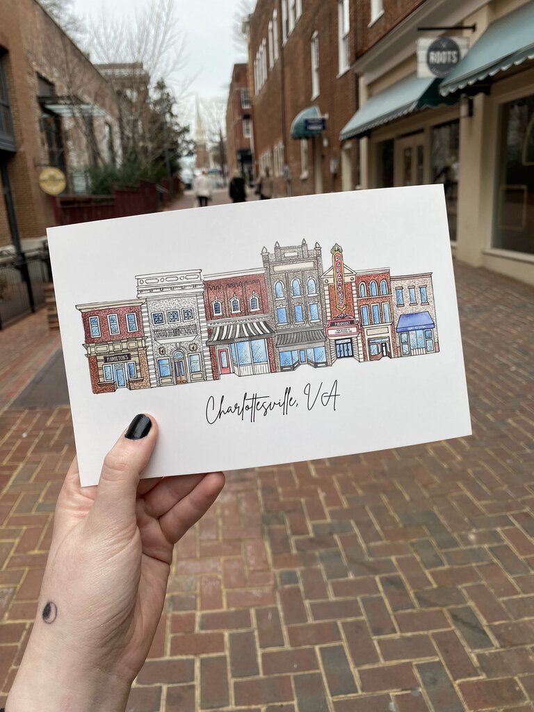 This 5.5"x8.5" art print of Charlottesville, Virginia's historic/small business staples was drawn with pencil, painted with watercolor, then drawn again with fountain pen. The print features some of the most distinguishing small businesses and eateries of downtown Charlottesville.