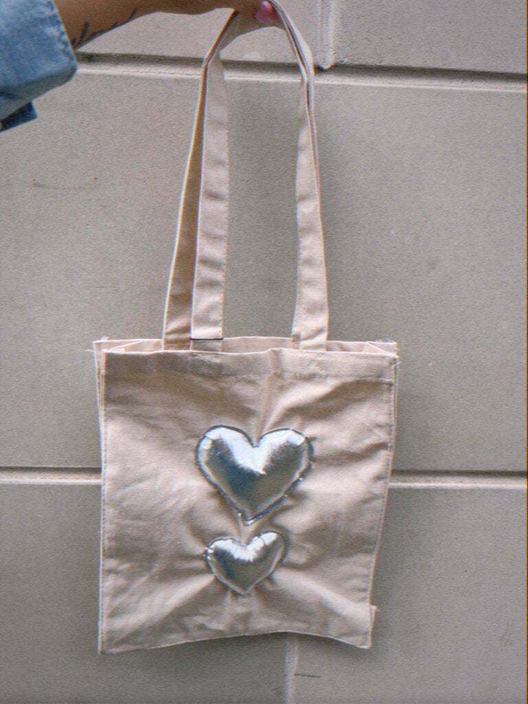 Featuring repurposed tshirts and upcycled secondhand garments adorned with metallics and puffy hearts, femme bows and ribbons, and custom designed tote bags and bag accessories.