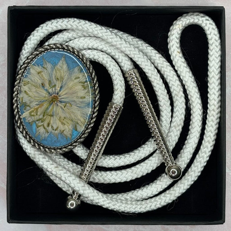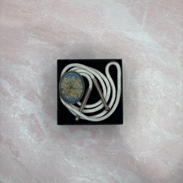 A dashing bolo made with resin preserved botanicals on a blue background and simple white cord.