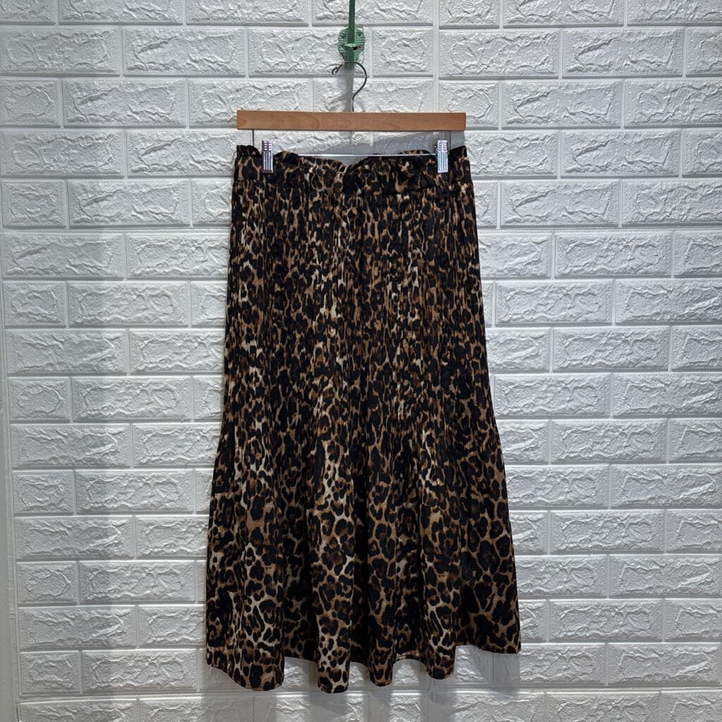 Pleated Leopard Print Pull On Midi Skirt