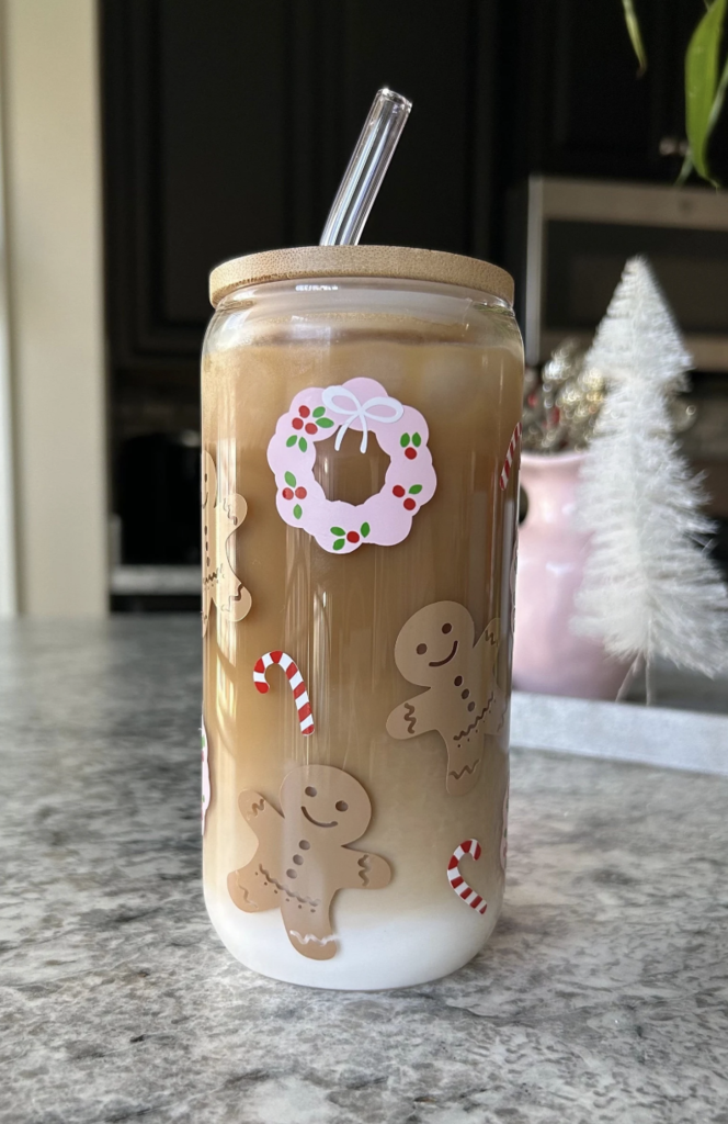 This fun gingerbread and pink wreath glass is the perfect gift for a PINK Christmas! Put your coffee in a fun, holiday cup!
